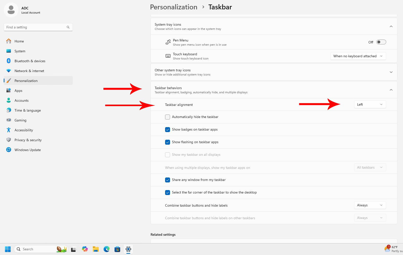 From the Taskbar settings, select Taskbar behavior, Taskbar alignment, and change it from Center to Left.